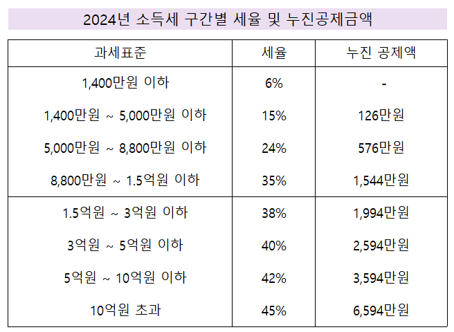 - 종합소득세: 과세표준에 따라 6%~45%의 세율이 적용됩니다.